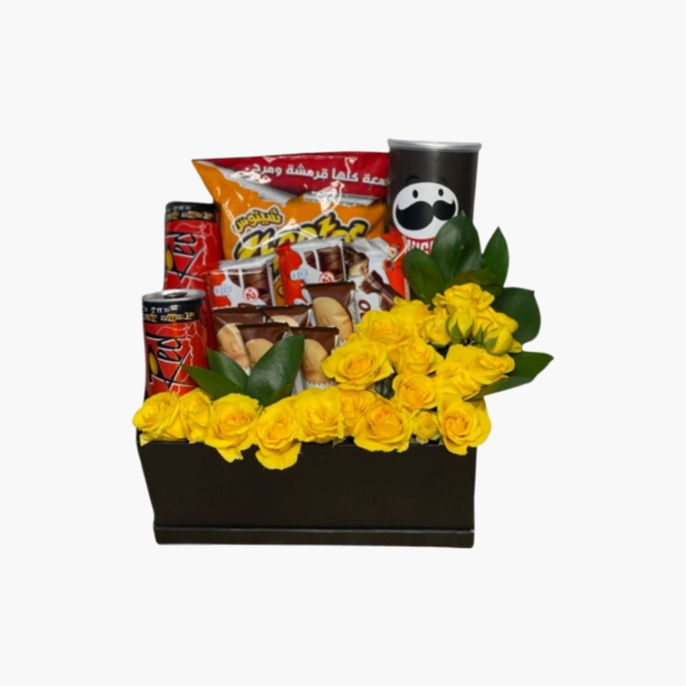 أفكار هدايا بسيطة من متجر أريف، اطلب الآن تنسيق بوكس هدايا يحتوي على مفرحات مزين بالورد الطبيعي: